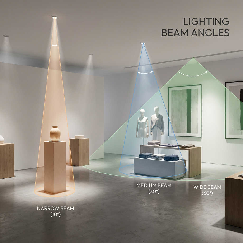 Narrow beams are used to precisely highlight individual products and create a sense of exclusivity. Medium beams provide balanced lighting that accentuates product areas without appearing too harsh. Wide beams ensure even and pleasant general lighting that ties the entire room together.